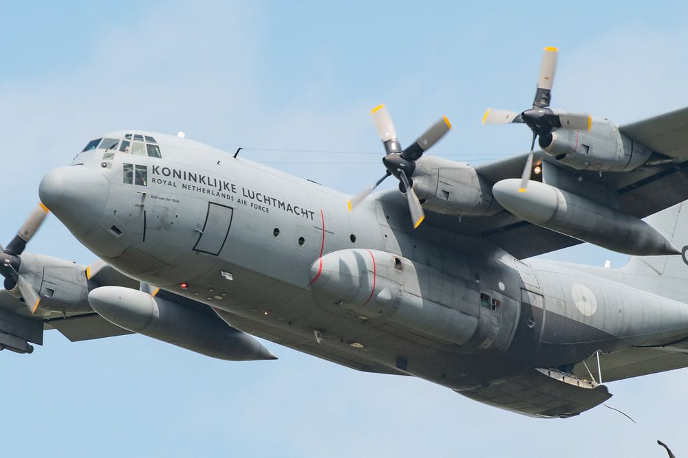 Lockheed C-130 Hercules transportvliegtuig dropt militair materieel aan parachute tijdens de Air Power Demo op de Luchtmachtdagen 2019.