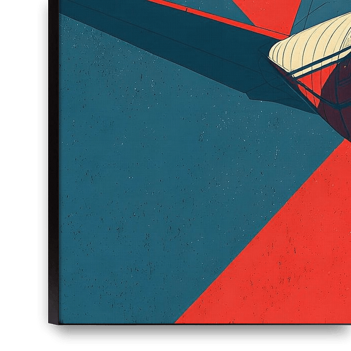 Dieses stilisierte Werbeposter aus den 1970er Jahren zeigt in einer klaren Vektorgrafik eine Lockheed C-130 Herkules im Landeanflug. Die reduzierte Farbpalette aus Weiß, Rot und Blau verleiht dem Design eine markante und moderne Ästhetik, die die technische Präzision und Stärke des Flugzeugs betont. Die dynamische Darstellung des…