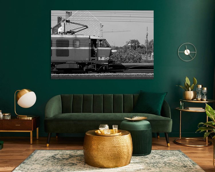 Op een warme zomerdag trekt de elektrische locomotief 2014 een lange goederentrein geladen met auto's. De deur van de bestuurderspost staat open en toont een begeleidende spoorman (niet de machinist) op een eenvoudige stoel. Dit locomotieftype dateert uit 1975.