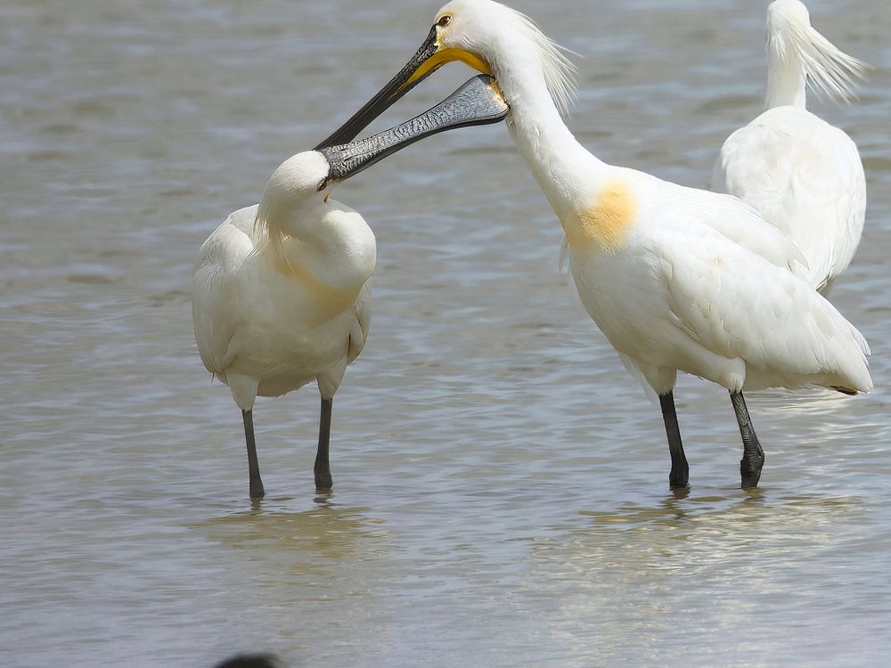Was für eine Liebe unter den Löfflern, sie putzen sich gegenseitig das Gefieder bis zur Perfektion. Eine Freude zu beobachten, wie sie unermüdlich weitermachen. Im Vordergrund der Austernfischer und sehr schön versteckt irgendwo ist der Alpenstrandläufer zu sehen.