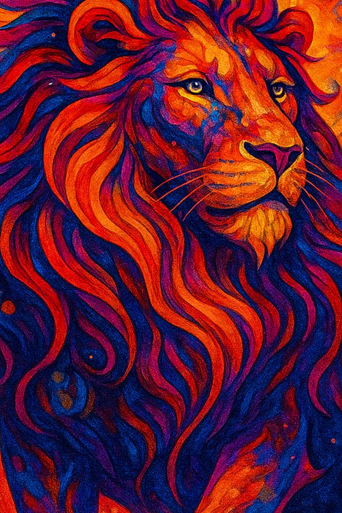 Löwe ist das Zeichen des Herzens, des Ausdrucks, der Kunst, des Stolzes und des Mutes. Diese visuelle Ode fängt diese Energie in einem Wirbelsturm aus warmen Farben ein: Gold, Feuer und Licht. Die Sonne, Herrscherin dieses Zeichens, leuchtet hinter ihm wie eine göttliche Aura. Alles strahlt Kraft, Leidenschaft und Kreativität aus.