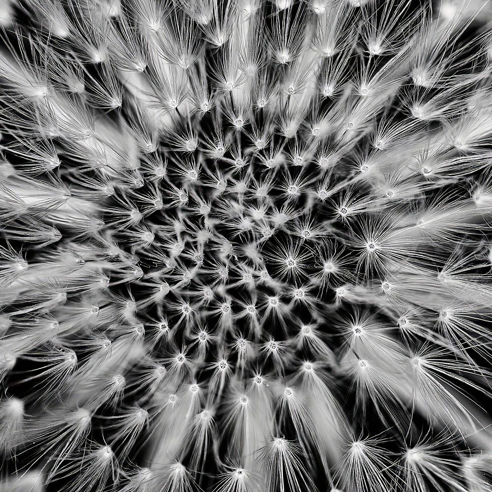 Eine Draufsicht auf eine Pusteblume. Er erinnert mich ein wenig an einen altmodischen gehäkelten Spitzenteppich. Wie schön die Natur ist!