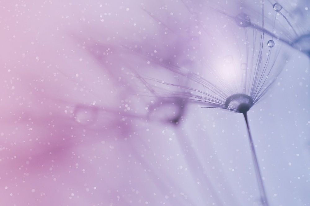 Makroaufnahme von Löwenzahnflaum in einer verträumten Welt aus Rosa, Lila und Blau.