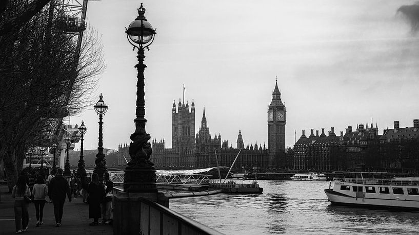 Eine stimmungsvolle Schwarz-Weiß-Aufnahme von London, in der die ikonische Skyline entlang der Themse im Mittelpunkt steht. Die imposanten Konturen des britischen Parlaments und der berühmte Glockenturm (Big Ben) dominieren das Bild und verleihen der Stadt sofort einen unverwechselbaren Charakter.