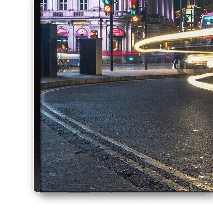 Eine Nachtszene vom Piccadilly Circus in London. Das Foto fängt die lebendige und dynamische Atmosphäre des Viertels ein, wobei die Lichtspuren von fahrenden Fahrzeugen bunte Streifen durch das Bild ziehen. Die Gebäude sind beleuchtet und das ikonische Londoner U-Bahn-Schild ist rechts im Bild zu sehen. Die im Foto verwendete Langzeitbelichtung hebt die Bewegung und Energie des Ortes hervor und macht es zu einer interessanten und visuell auffälligen Darstellung des Piccadilly Circus.