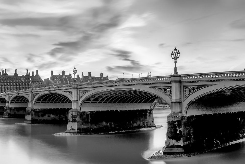 Im Bild der Palace of Westminster, Westminster Abbey , sowie der Big Ben zusammen mit der Westminsterbridge. Schwarzweiss Fotografie 90320045ays