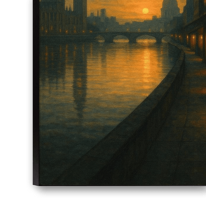 Die Komposition führt den Blick entlang des geschwungenen Stegs und verschmilzt die menschliche Architektur mit der natürlichen Reflexion. Das Wasser dient als Spiegel und Metapher Londons - fließend, beständig, immer das Licht zurückflüsternd, das es berührt. Durch die gemessene Pinselführung wird die Formalität der Stadt in Poesie umgewandelt. Die Szene wird zu einer Elegie auf die Zeit, den Rhythmus und die Ruhe und beweist, dass selbst in einer Metropole der Bewegung die Gelassenheit überdauert.