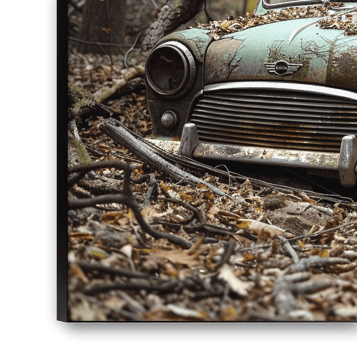 Dieses atmosphärische Bild zeigt einen grünen verrosteten Mini Cooper, der im Wald verlassenen zur Ruhe gekommen ist. Die einstige leuchtende Farbe des Kultautos ist nun von einer Schicht aus Schmutz, Moos und herabgefallenem Laub bedeckt, was ihm eine reiche, gelebte Patina verleiht. Das Licht beleuchtet sanft die Spuren der Zeit. Die umgebenden rostigen Strukturen, und die überall wachsende Vegetation erzählen eine Geschichte von Vernachlässigung und der unaufhaltsamen Rückeroberung durch die Natur, wobei der Mini als stummer Zeuge dieser Verwandlung verweilt.