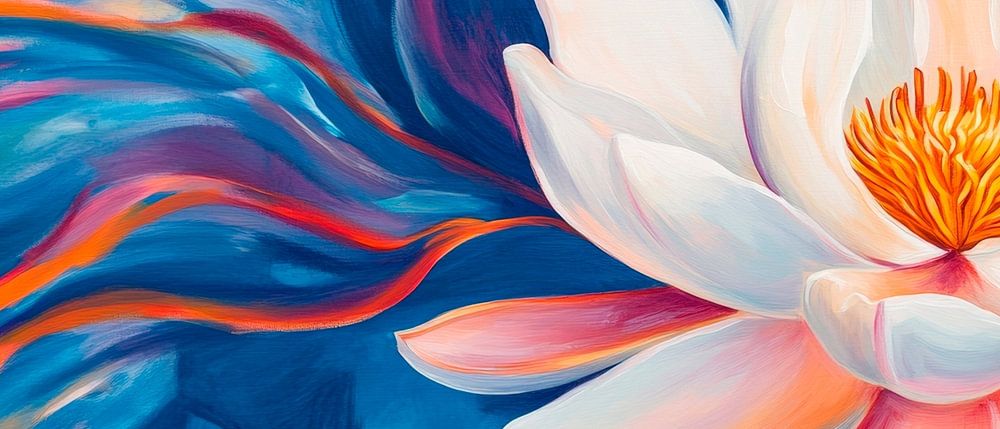 Inmitten einer schimmernden, tiefblauen Landschaft entfaltet sich die anmutige Blüte einer Lotusblume. Ihre zarten, weißen Blütenblätter scheinen zu strahlen, während lebendige Farbschleifen wie ein sanfter Wind um sie tanzen. Dieses Kunstwerk bringt Ruhe und Eleganz und würde perfekt in ein Schlafzimmer oder einen ruhigen Rückzugsort passen.