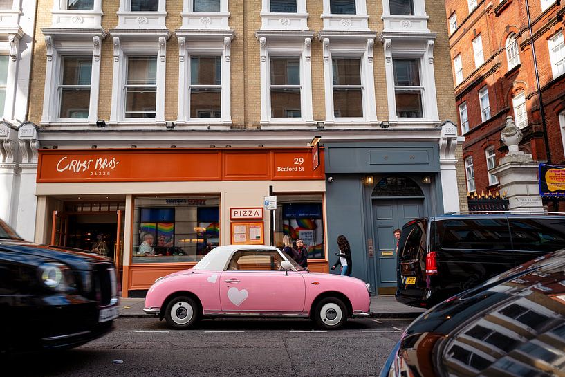 In einer Londoner Seitenstrasse steht ein altes Auto in kräftigem Pink, das sich deutlich von der sonst zurückhaltenden Umgebung abhebt. Der nostalgische Wagen wirkt wie ein Farbakzent voller Leichtigkeit und setzt einen verspielten Gegenpol zur urbanen Szenerie – ein kleines Statement von „Love“ mitten im Stadtalltag.