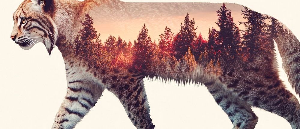 Ein majestätischer Luchs schreitet durch eine traumhafte Waldlandschaft, die sanft in sein Profil eingeht. Die warme Farbpalette des Sonnenuntergangs harmoniert perfekt mit der Natur, während die lebendige Tierdarstellung zum Träumen einlädt. Dieses Kunstwerk verleiht jedem Wohnzimmer eine besondere Note und schafft eine entspannende, inspirierende Atmosphäre.