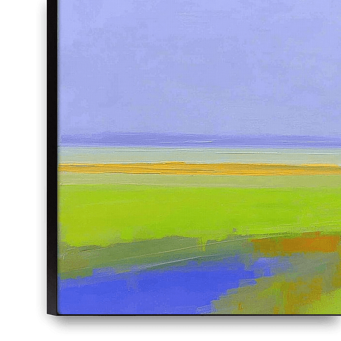 Lucht | Quiet Sky, Yellow Grove - Het schilderij ademt ruimte; het grootste deel bestaat uit een uitgerekte, zachte lucht die langs de randen bijna fluisterend overgaat van lichtblauw naar een lavendelachtige gloed. Die hemel is geen achtergrond, het is het onderwerp — een lucht schilderij waarin kleurvlakken en subtiele penseelstreken…