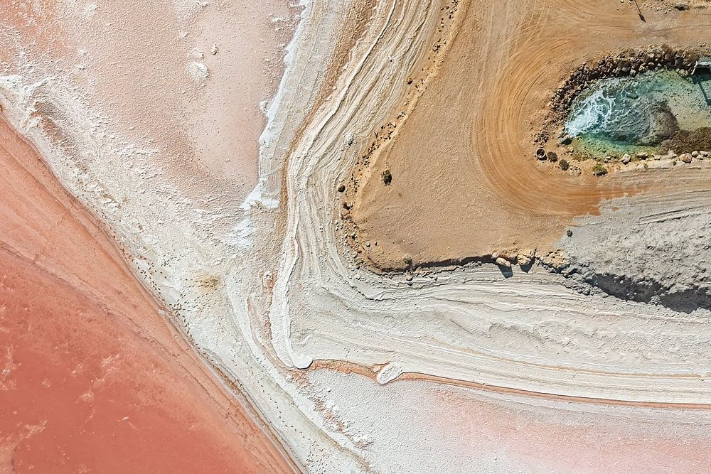 Eine atemberaubende Luftaufnahme fängt eine auffällige Landschaft mit kontrastreichen Farben ein, wobei kräftige Rosa- und Erdtöne ein natürliches abstraktes Muster bilden. Die Kombination aus wirbelnden Linien und einzigartigen Farbabstufungen lässt auf ein geologisch vielfältiges Gebiet schließen, möglicherweise eine Salzwüste oder eine Region mit Mineralienvorkommen.
