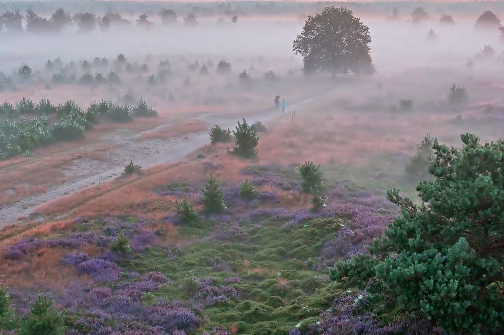 Luftaufnahme des Sonnenaufgangs auf der Veluwe mit blühendem Heideland in den Niederlanden