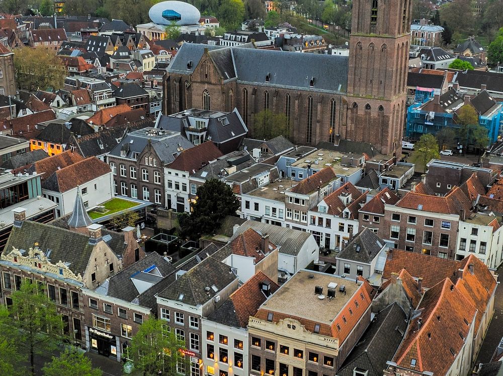 Das Stadtzentrum von Zwolle mit dem Melkmarkt aus der Vogelperspektive bei Sonnenuntergang im Frühling. Aus der Vogelperspektive sind verschiedene historische Gebäude zu sehen, wie zum Beispiel der Peperbus-Kirchturm.