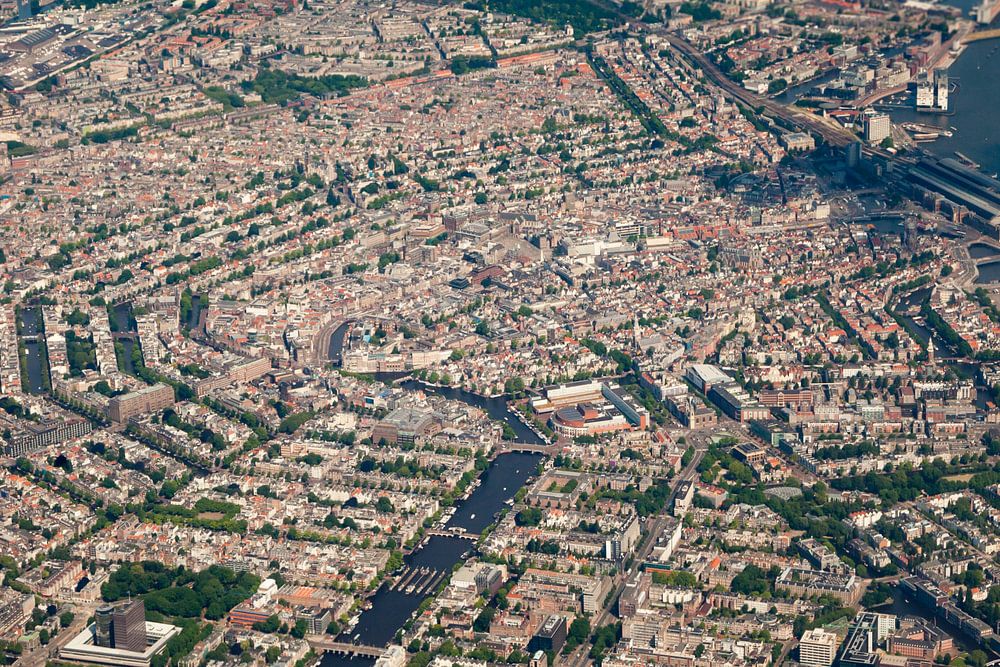 Luftaufnahme des alten Zentrums von Amsterdam mit deutlich sichtbarem Grachtenring