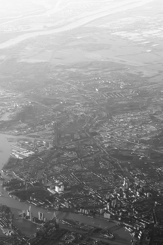 Eine Luftaufnahme von Rotterdam und der Maas, die in die Nordsee mündet. Schwarz-Weiß-Foto mit bekannten Rotterdamer Gebäuden wie der Erasmusbrücke,
