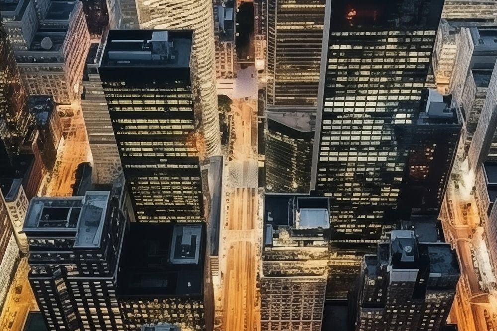 Luftbild von oben von einer fliegenden Drohne einer globalen Stadt mit Entwicklungsgebäuden,
