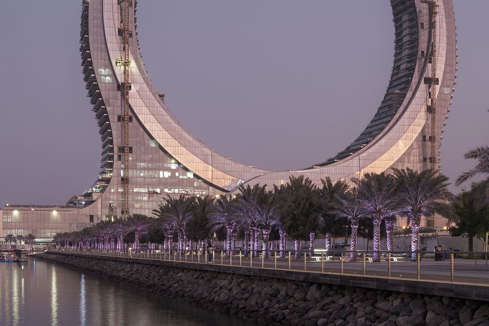 Lusail Corniche in Lusail City, Katar am Yachthafen Sonnenuntergang Schuss zeigt Menschen zu Fuß auf der Promenade mit Skyline im Hintergrund