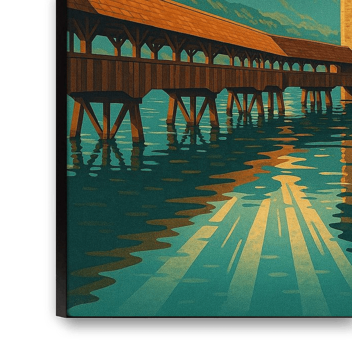 Feiern Sie die Schönheit von Luzern mit diesem atemberaubenden Art-Déco-Reiseplakat, das den Charme des Schweizer Seejuwels in Ihre Räume bringt. Das Kunstwerk zeigt die Kapellbrücke und ihren ikonischen Wasserturm mit dem majestätischen Pilatus im Hintergrund. Stilisierte Lichtstrahlen erstrecken sich über den Himmel und verleihen dem Bild Tiefe und Dramatik in echter Vintage-Poster-Manier. Die Farbpalette aus Aquablau, sanften Erdtönen und goldenen Akzenten schafft eine warme und einladende Atmosphäre, die an die Reisekunst der Mitte des Jahrhunderts erinnert. Ideal für Sammler von Schweizer Postern, Gebirgslandschaften oder Art-Déco-Designs, ist dieses Wandbild eine vielseitige Ergänzung für moderne und klassische Innenräume. Luzerns Mischung aus natürlicher Schönheit und mittelalterlicher Architektur ist hier perfekt dargestellt und macht es zu einem durchdachten Geschenk für Reisende, Bergliebhaber oder Bewunderer der Schweizer Kultur. Dieses in höchster Qualität gedruckte Poster ist ein zeitloser Wandschmuck.