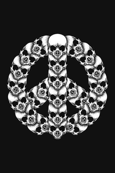 Diese Illustration interpretiert das ikonische Peace-Zeichen neu und besteht aus einer sorgfältig komponierten, rhythmischen Anordnung menschlicher Schädel.