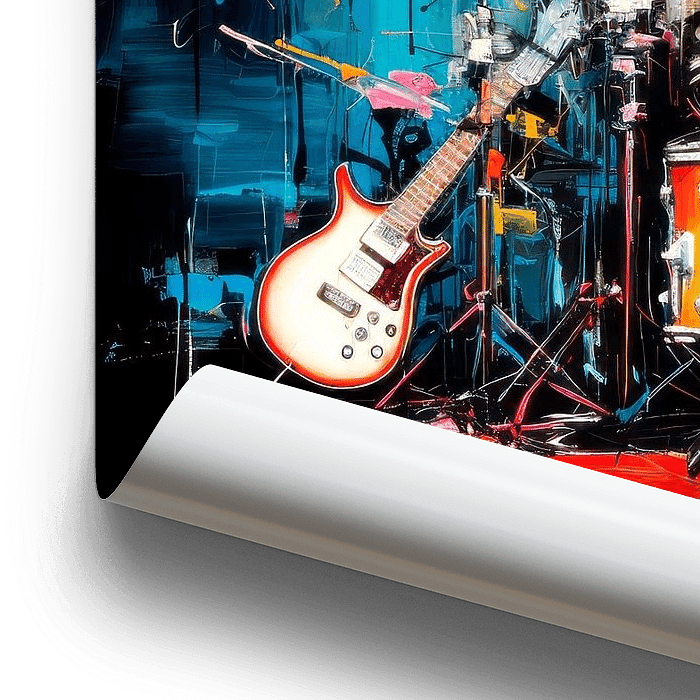 Was wäre die Welt ohne Musik? Entdecke eine Gitarre mit Schlagzeug auf einer Bühne in einem farbenfrohen abstrakten expressionistischen Stil. Fantastische dekorative Inszenierung mit kräftigen Farben. Das Motiv ist in Zusammenarbeit mit KI entstanden.