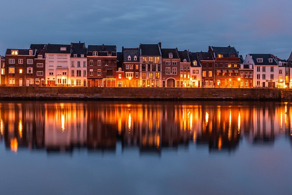 Dieses Foto fängt den romantischen und ruhigen Charakter Maastrichts in den späten Abendstunden ein, wenn die Stadt in einem subtilen, einladenden Licht erstrahlt. Die Spiegelung im ruhigen Wasser verleiht der Komposition eine zusätzliche Dimension von Schönheit und Tiefe.