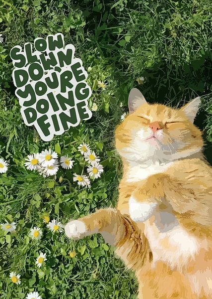 Eine flauschige orangefarbene Katze faulenzt selig im hohen grünen Gras, umgeben von weißen Gänseblümchen, die Augen halb geschlossen in purer Entspannung. Ein auffälliger handgeschriebener Text überlagert das Bild und lautet „ "SLOW DOWN YOU'RE DOING FINE," “ (Entspann dich, du hast es verdient). Er verbindet eine…