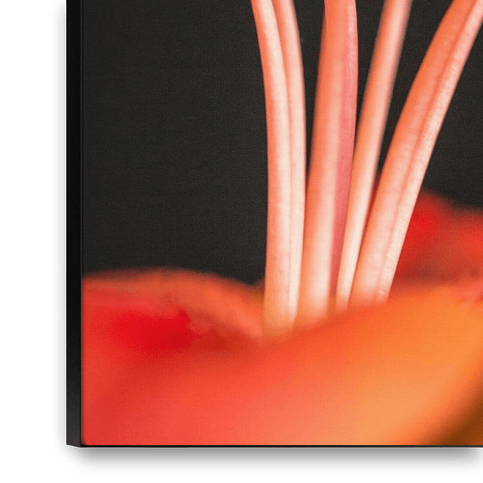 Een macrofoto van een warm oranje lelie waarbij de stamper en meeldraden rechtovereind staan. Groot contrast met zwarte achtergrond.