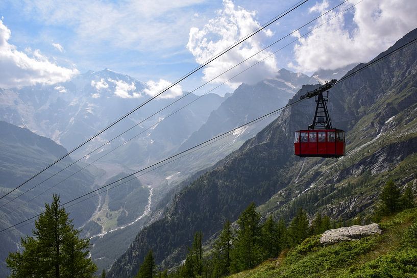 Die Seilbahn des Passo Moro über dem höchsten Teil des Valle Anzasca in den italienischen Alpen, mit den mächtigen Viertausendern des Monte-Rosa-Massivs im Hintergrund.