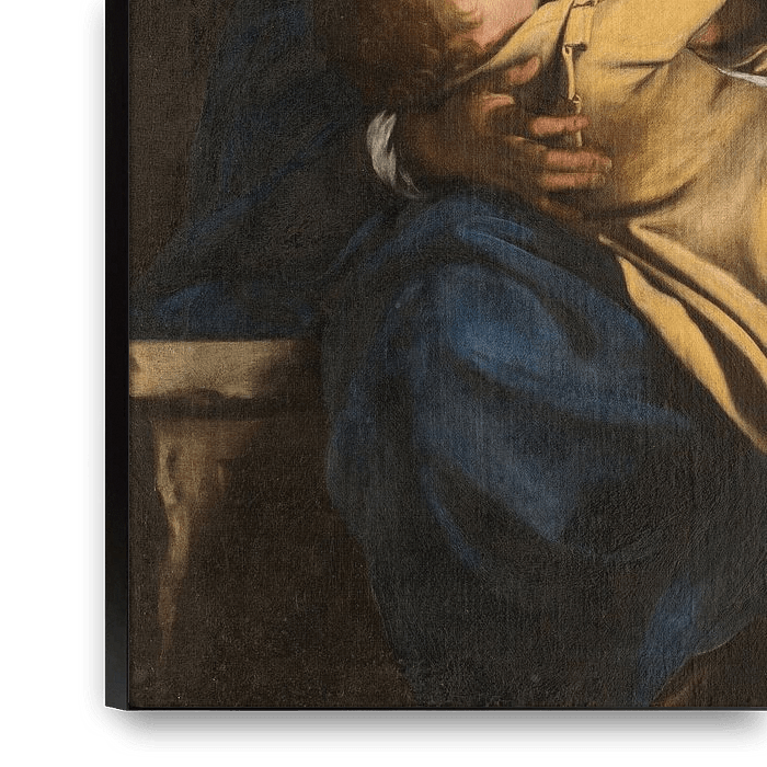 Weder die Jungfrau noch das Jesuskind blicken in Orazio Gentileschis Gemälde auf den Betrachter: Die gesamte Szene ist auf der Leinwand festgehalten, und das Wesen des Werks liegt im Wechselspiel der Blicke und Berührungen zwischen Mutter und Sohn. Die rituelle Feierlichkeit, die die Darstellungen der Jungfrau und des Kindes durchdringt, fehlt: Abgesehen vom goldenen Rand des Heiligenscheins könnte man meinen, es handele sich um ein weltliches Motiv, das einen Moment familiärer Intimität darstellt. Diese Wirkung wird auch durch die Farbgebung erzielt, die auf einem matten Grund aus Ocker- und Brauntönen ruht: Das Gemälde erstrahlt durch die Fleischtöne von Mutter und Kind sowie durch die Dreiteilung der reinen Farben (Rot, Gelb und Blau) in ihren Gewändern.