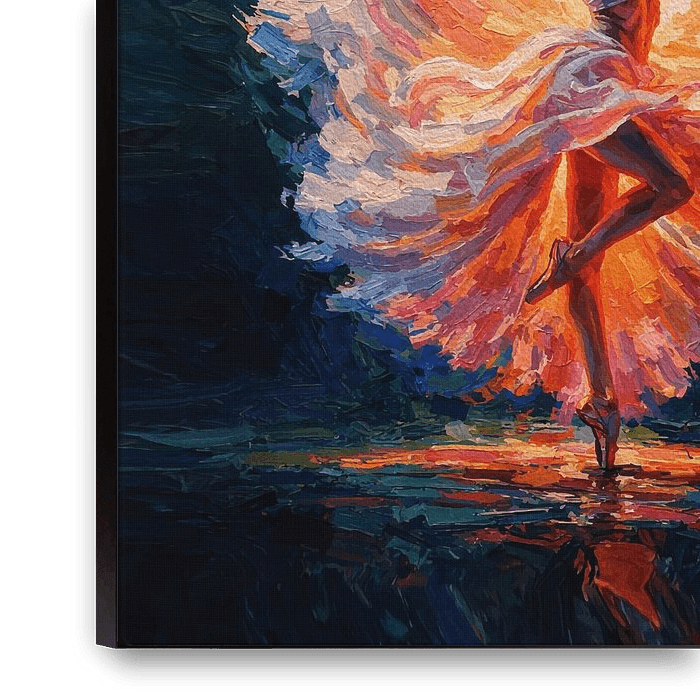 Dramatisches Impasto-Ölgemälde einer Ballerina, die einen Phönix mit explosiven Flammenflügeln verkörpert. Vermittelt Erneuerung und Kraft - heroische inspirierende Kunst für moderne Motivationswände.