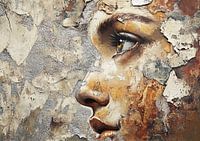 Powerful Gaze Painting - Dieses Frauenporträt ist eine ausdrucksstarke Darstellung, bei der ein realistisches Auge im Mittelpunkt steht, das aus einer verwitterten, abstrakten Oberfläche in Beige, Braun und Grau hervortritt und den Betrachter mit einem kraftvollen Blick anschaut.