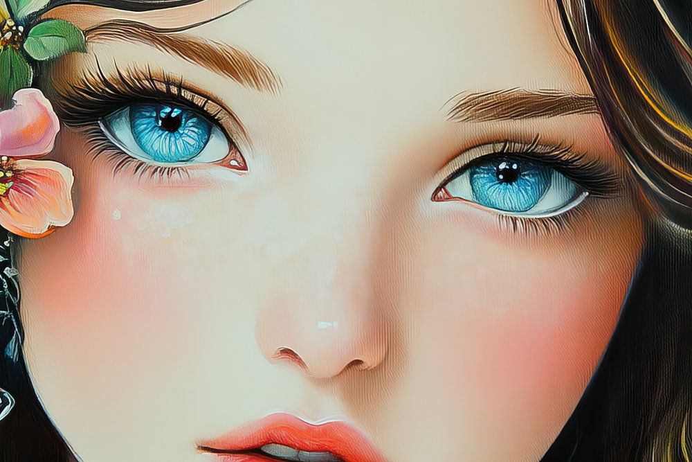 Mädchen Blumen | Mädchen mit großen Augen - Dieses Frauenbild zeigt ein Mädchen mit großen blauen Augen, verziert mit Blumen und einem Schmetterling, der um ihren Kopf herumflattert und ihr einen frischen und lebendigen Look verleiht.