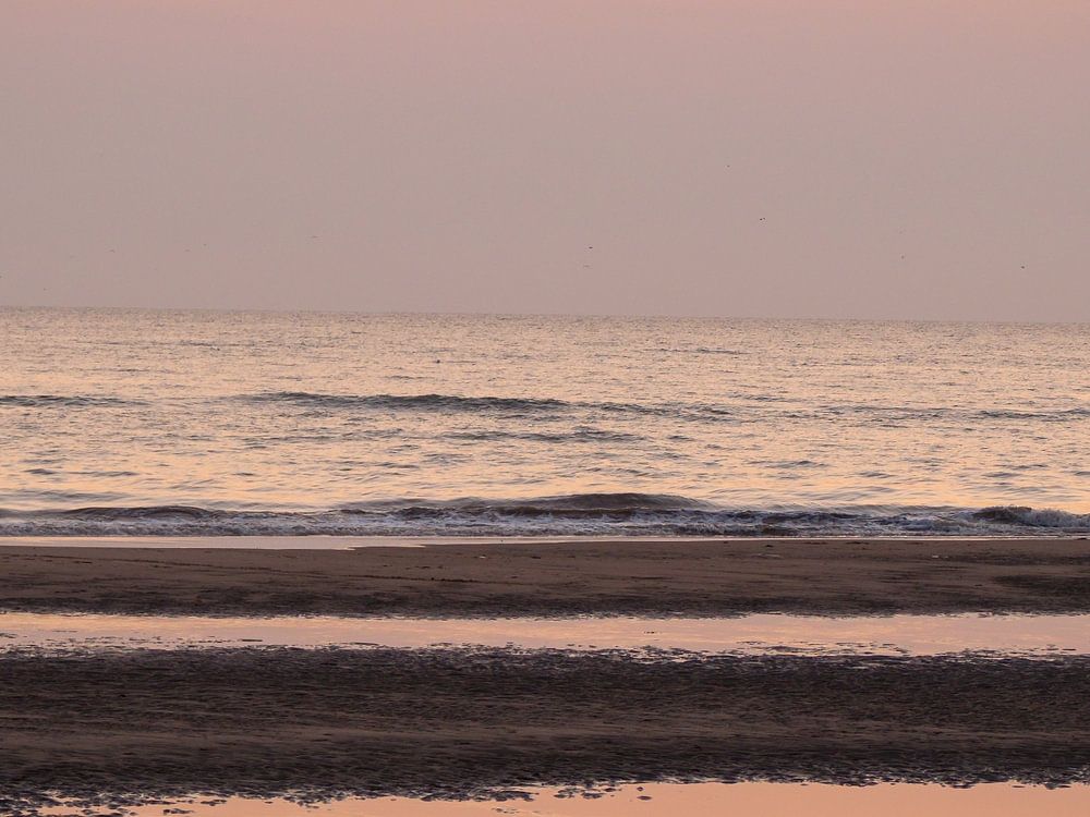 Eine junge Frau beobachtet den Sonnenuntergang am Strand von Camperduin in Nordholland.