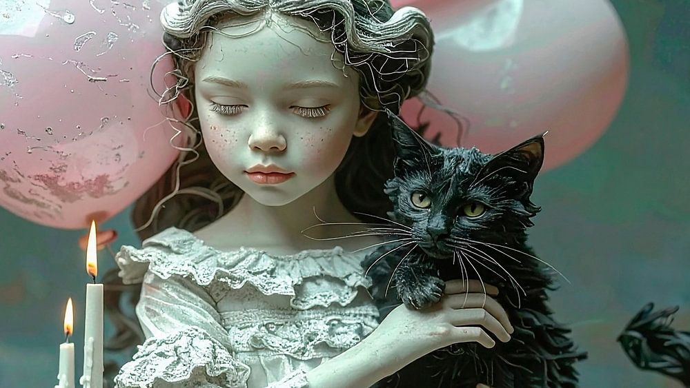 Ein schönes Mädchen mit langen Haaren und einem Spitzenkleid sieht aus wie eine Statue. Sie hat die Augen geschlossen und hält in ihren Armen eine schwarze Katze. Hinter ihr schweben rosa Luftballons, die aussehen, als seien sie aus Marmor. Der baufällige Hintergrund verleiht dem Ganzen einen Retro-Look. Das Bild wurde mit ai erstellt.