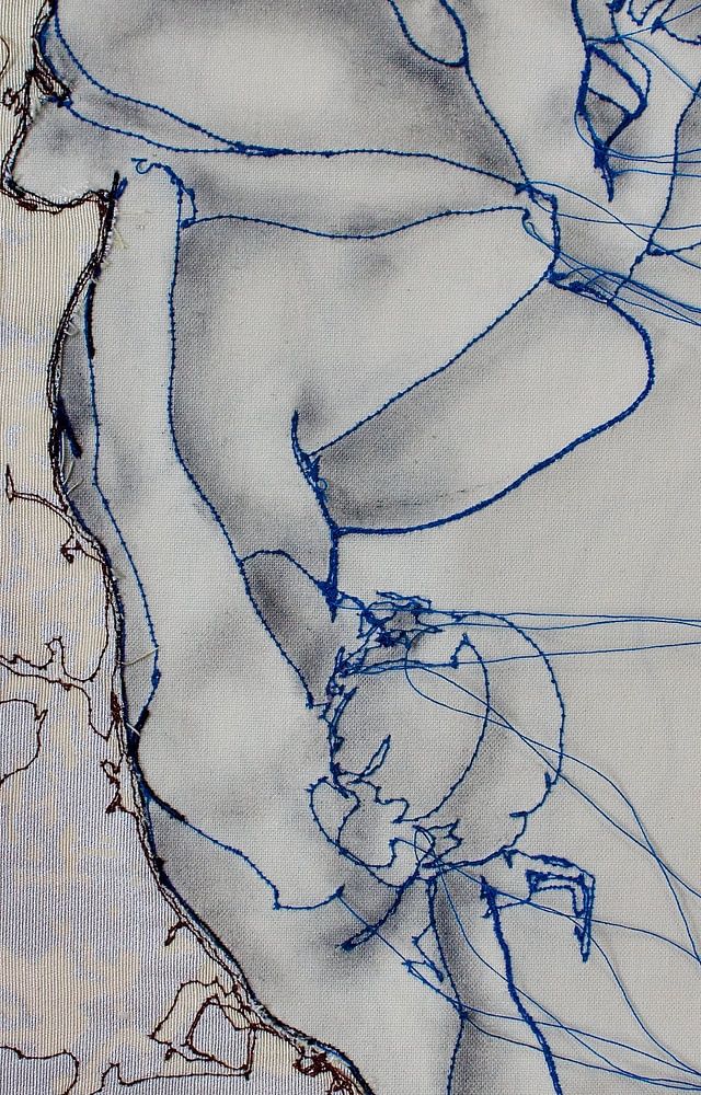 Ein figuratives Werk aus blauen und braunen Fäden auf Textil. Basierend auf dem Werk von Egon Schiele. Weibliche Figuren, Sinnlichkeit, Stärke und Verletzlichkeit sind ein wiederkehrendes Thema in Kims Werken. Die losen Fäden stehen für Veränderung, Wachstum und Bewegung #expressionism #art-nouveau