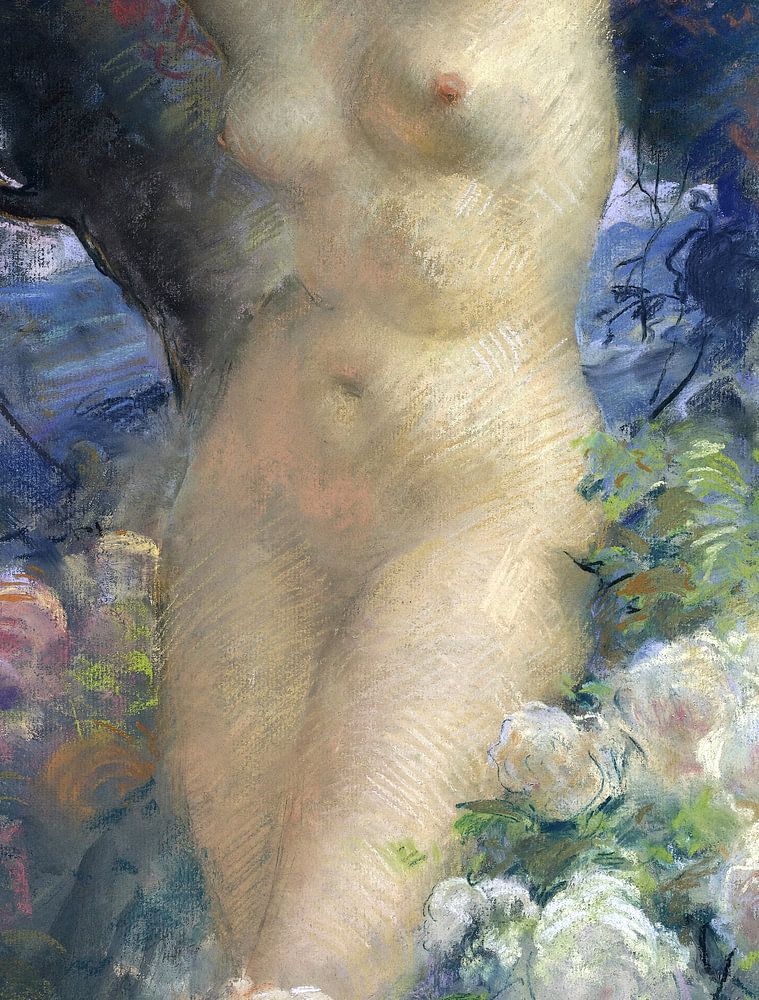 Frau, nackt in einem Rosengarten. Die junge Dame hat einen Blumenkranz auf dem Kopf. Ihre Hüften, Brüste und Arme sind nackt und sichtbar.