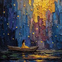 Bestelle diese Malerei Mädchen in einem schwimmenden Boot unter fallenden Sternen von Aden Pink Studio als Reproduktion auf Leinwand, Alu-Dibond, als Poster, Fototapete oder Acrylglasbild.