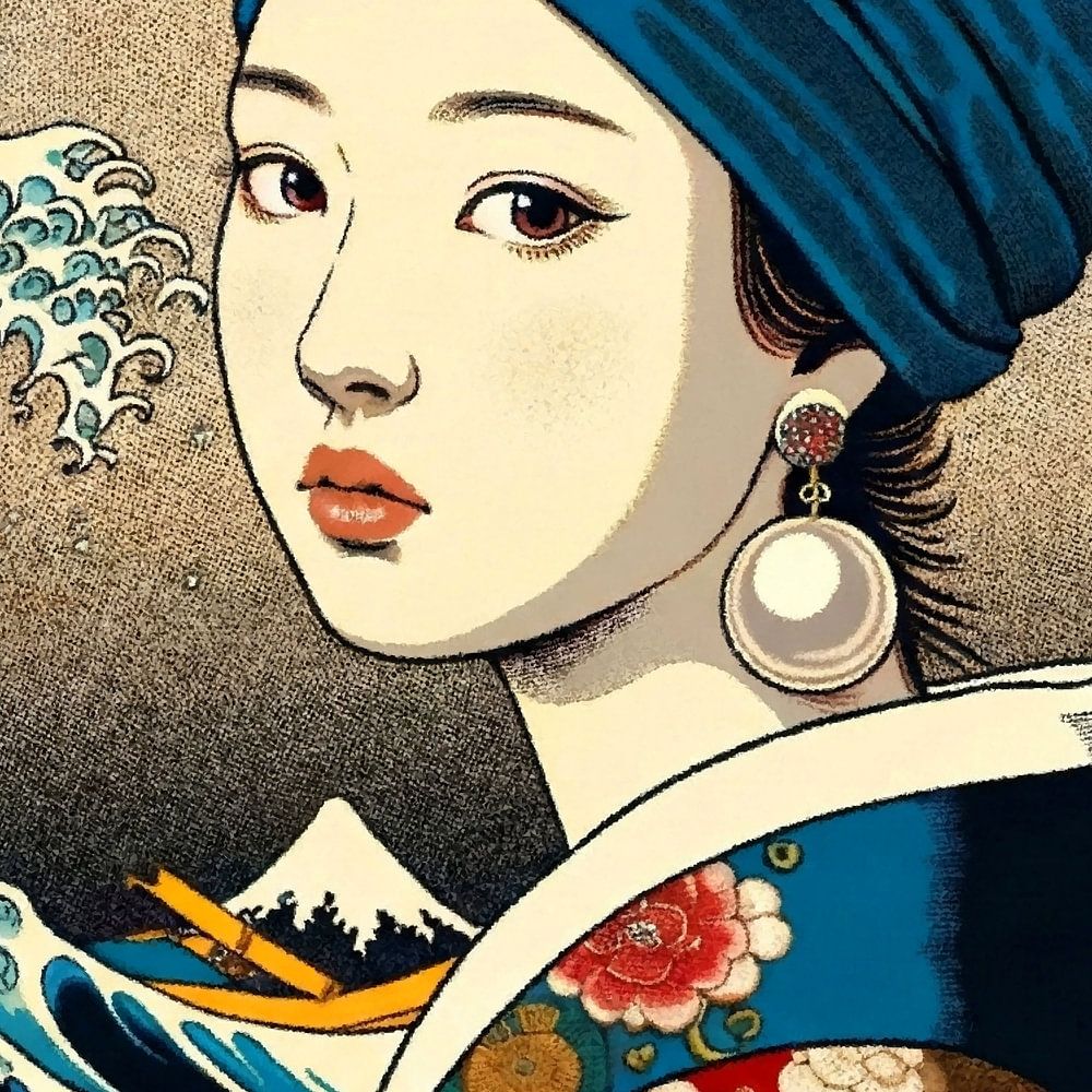 Für dieses Werk habe ich das „Mädchen mit der Perle“ mit japanischer Atmosphäre und Wellenformen kombiniert. Man sieht eine junge Frau mit ruhigem Blick, einem blauen Kopftuch, einer großen Perle und einem Kimono voller Blumen und Muster. Hinter ihr treten die Wellen kraftvoll hervor. Das verleiht dem Bild Spannung, während das Porträt…