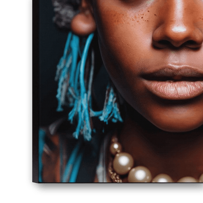 Dieses faszinierende Porträt zeigt eine junge Dame in einer schönen Kombination aus Blau und Rot um den Kopf. Sie schaut einen mit einem durchdringenden, ruhigen Blick direkt an und trägt eine Perlenkette. Dieses Porträt verkörpert die Kombination von Reichtum und Einfachheit und die Botschaft 'alles ist gut, alles ist inbegriffen.' Die verwendeten Techniken verbinden kreativen Geist und künstliche Intelligenz, was zu einem durchdringenden Porträt mit einem Hauch von Glamour führt. Es ist ein unverzichtbares Kunstwerk, das jedem Interieur sowohl Schönheit als auch Tiefe verleiht.