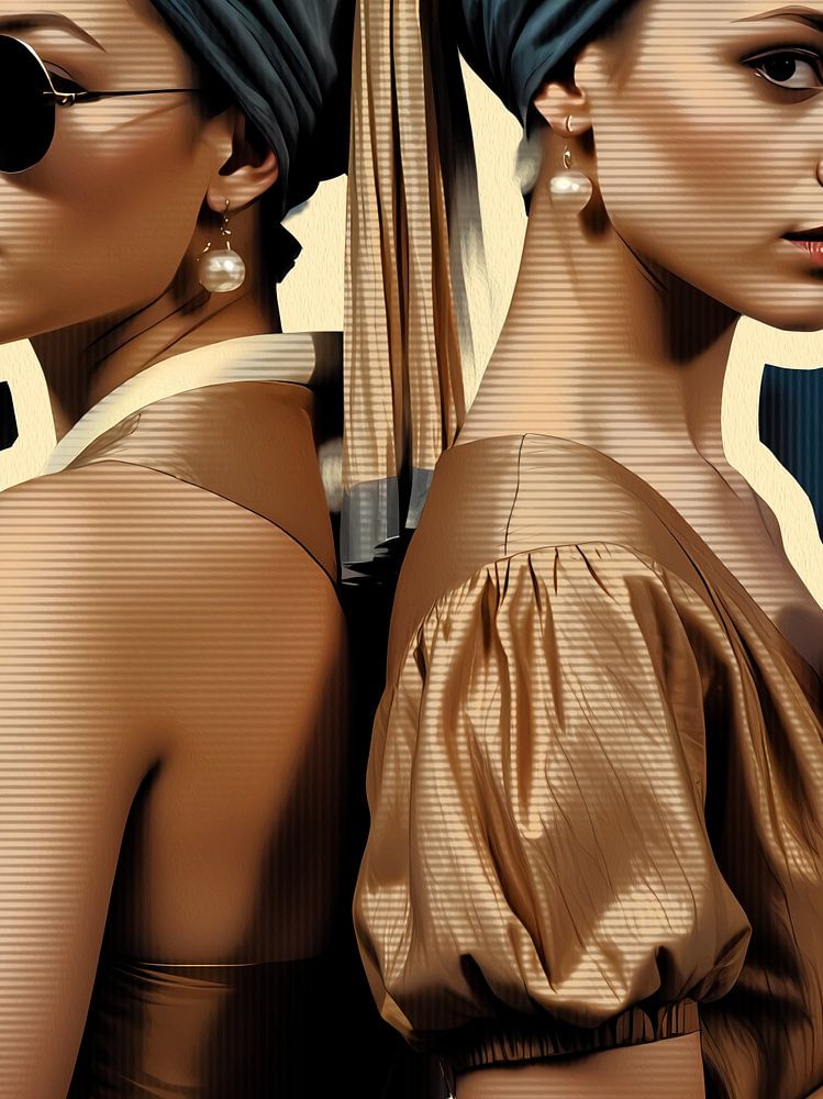Zwei Mädchen mit einer Perle, eine Anspielung auf das ursprüngliche Meisterwerk. Eine anschaulichere Annäherung an das Thema, mit nicht einem, sondern zwei Mädchen, von denen eines eine sehr große Perle in der Hand hält.