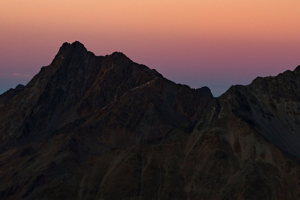 Märchenhafter Sonnenuntergang über einsamen Bergspitzen in den österreichischen Alpen. Die untergehende Sonne lässt im Herbst schöne Farben in der Luft. Dieses Bild wurde in der Nähe des Kaunertaler Gletschers aufgenommen.