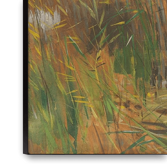 Bestelle Märkische Seenlandschaft mit Entenjäger im Kahn stehend, Karl Hagemeister als Reproduktion auf Leinwand, Alu-Dibond, als Poster, Fototapete oder Acrylglasbild.