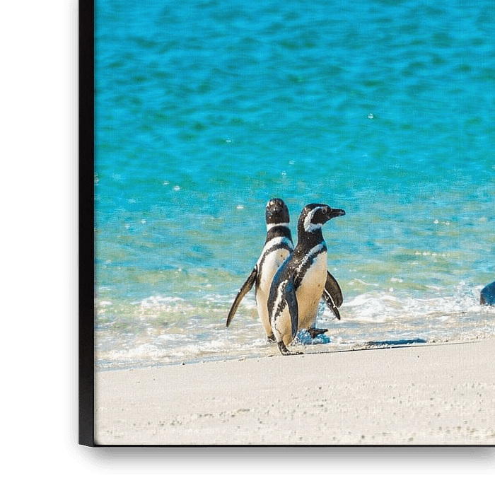 Magellanpinguine an einem tropisch anmutenden Strand auf den Falklandinseln. Das Wasser dort ist nur Eis und eiskalt.