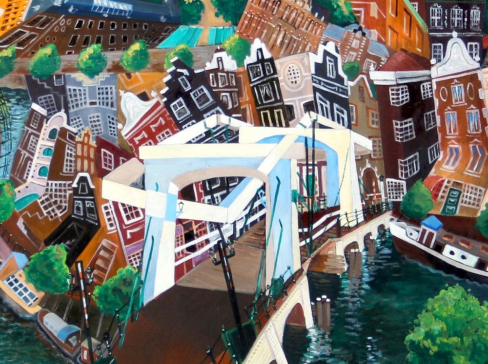 Ikone von Amsterdam, das berühmte Magere Brug über der Amstel. In der mittleren Eremitage rechts Carré und links die Stopera. Hausboote und Grachtenhäuser, kein Platz zum Abstellen Ihres Autos, sondern Fahrräder. Reichtum durch Handelsgeist, Kanalhäuser als Lager, jetzt als Häuser.