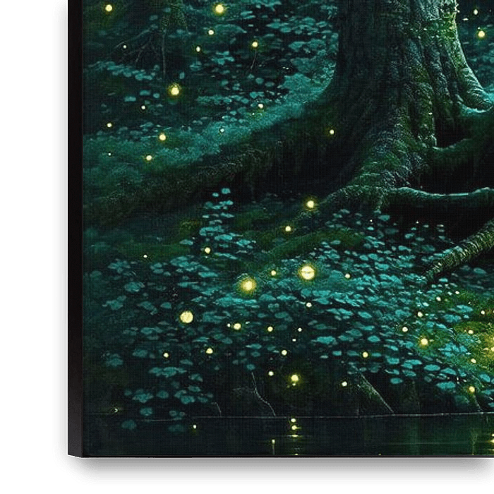 Über „Magischer Wald im silbrigen Schein des Vollmondes – Wächterbäume, flüsternde Schatten und das magische Leuchten der Glühwürmchen in einem nächtlichen Märchenwald“ von AidasignArt