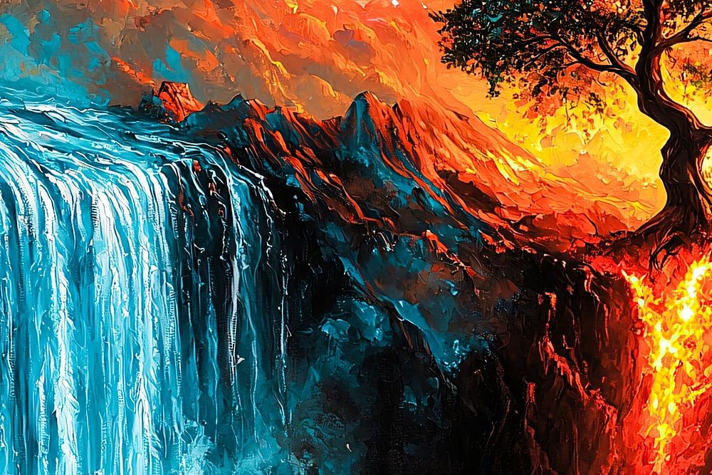 Ein wunderschönes Kunstwerk, das die Dualität von Natur und Kraft symbolisiert. Das Design zeigt einen atemberaubenden Wasserfall und einen feurigen Baum in einem harmonischen und kontrastreichen Farbenspiel. Perfekt für jeden Raum, der Energie, Mystik und Gleichgewicht ausstrahlen soll. Dieses einzigartige Stück zieht sofort die Aufmerksamkeit auf sich und bringt Leben in jeden Raum, vom modernen Wohnzimmer bis zum kreativen Büro.