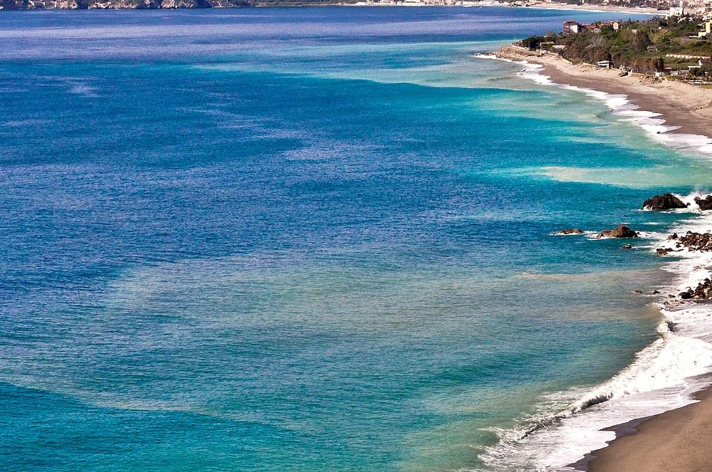 Ein kilometerlanger Küstenstreifen mit einer dynamischen, steinigen Felsenküste und einem einzigartigen, sauberen Meerwasser schlängelt sich entlang der Bucht von Taormina.