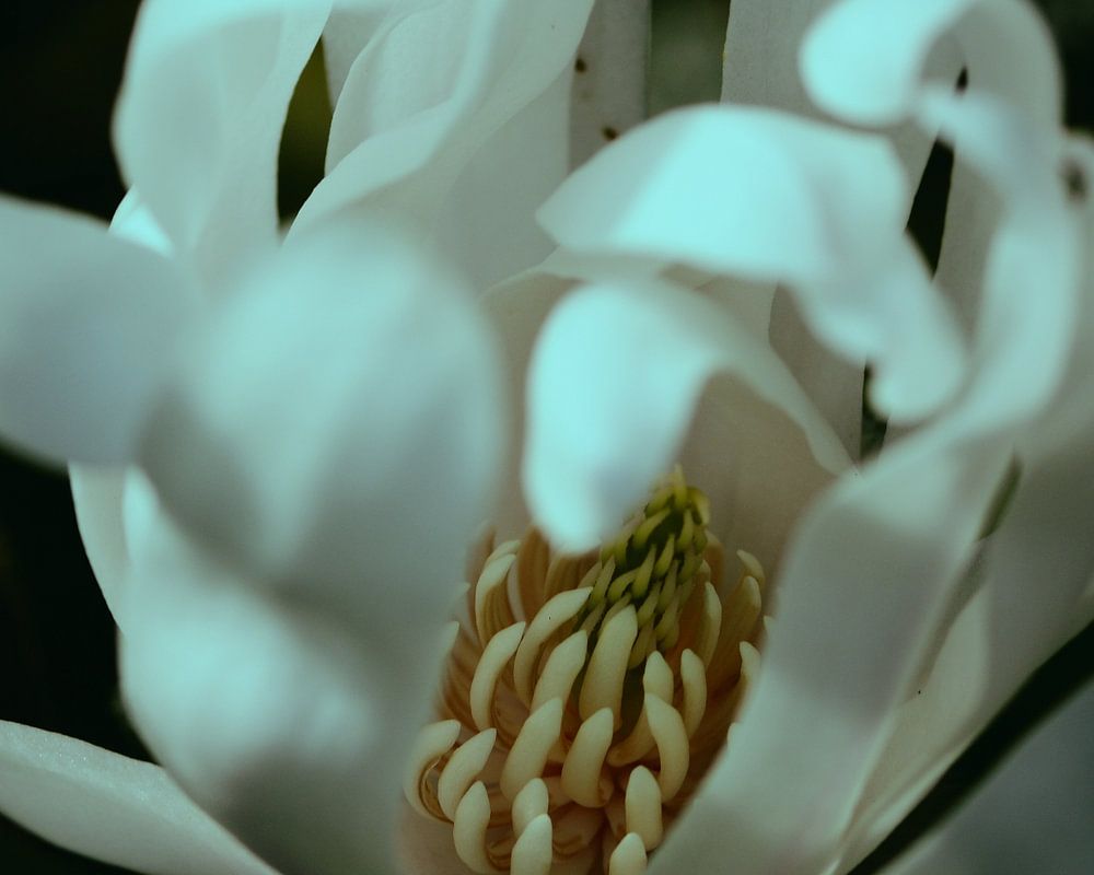 Mitte April beginnt der Magnolienbaum an den sonst kahlen Ästen zu blühen. Die Blumen duften köstlich. Die Magnolie wird auch als falscher Tulpenbaum bezeichnet, da einige der Arten an Tulpen erinnern. Makroaufnahme einer weißen Magnolie vor einem schwarzen Hintergrund.